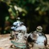 Brilliant speckles of green swirl across this hand-blown creation lending a soothing touch to your table setting.